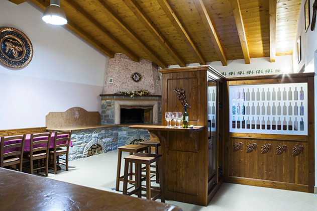 There’s a room with a fire, wood tables and a window on the vineyards.